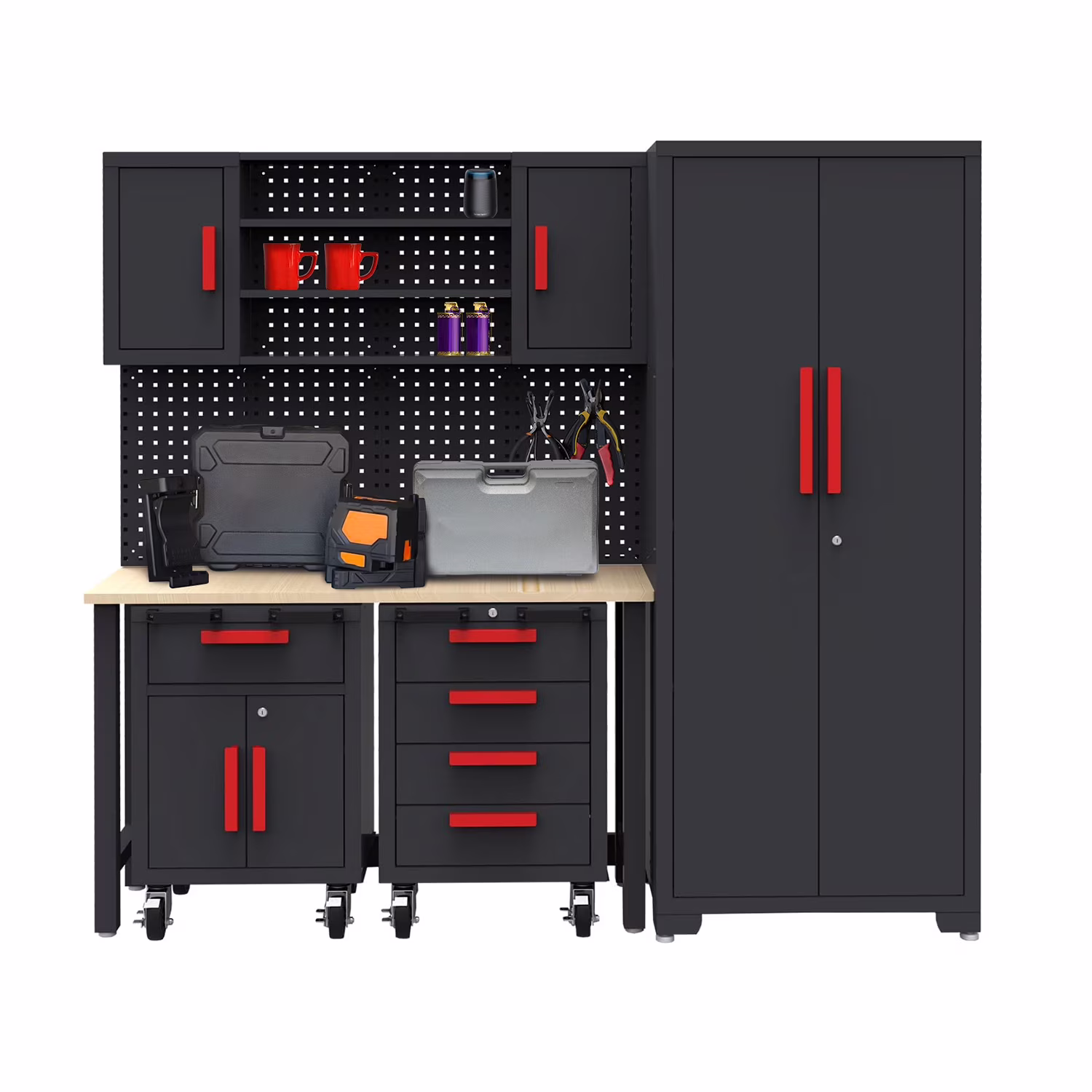 HPDAVV 6-Pcs Workshop Cabinet Set in Black with Workbench - Perfect for Organizing Garage and Tools - Included Steel Cabinets Drawers Shelving Rolling Chest 81.5"L 18.5"D 76"H Assembled Cabinet Kit