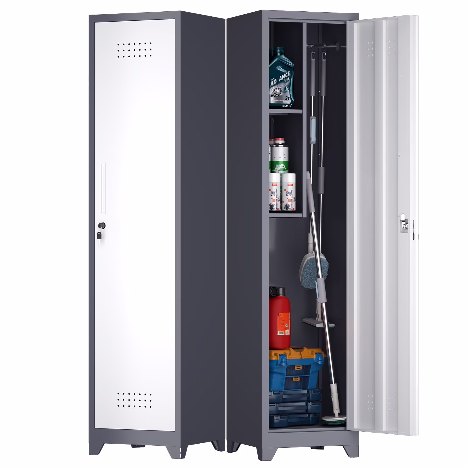 Marcree 65" H Slim Broom Storage Cabinet, Metal Broom Closet with Shelves and Hanging Rod, Utility Cabinet for Brooms and Mops, Tall Cleaning Storage Cabinet for Kitchen, Pantry, Office, Shop, Garage
