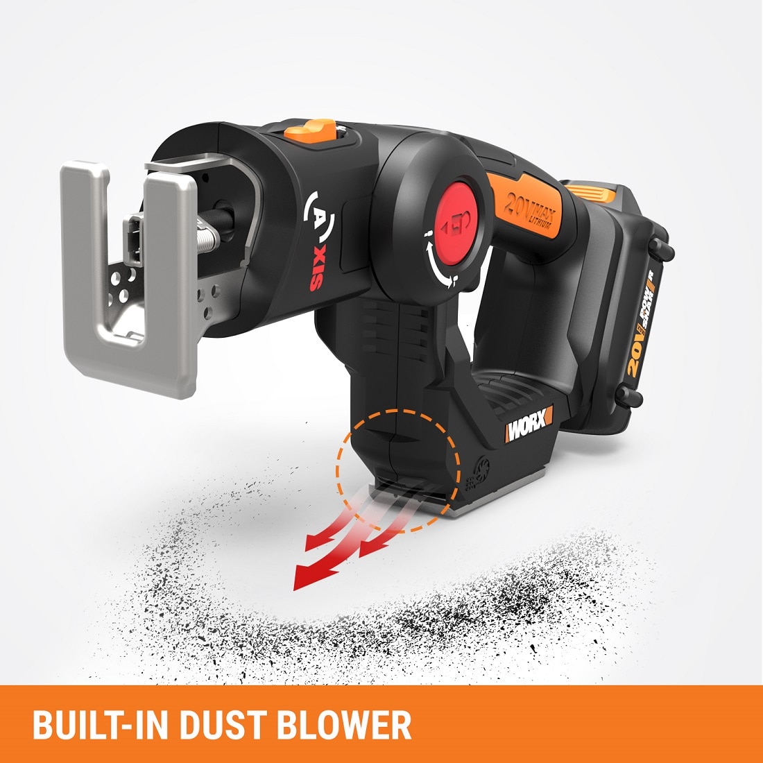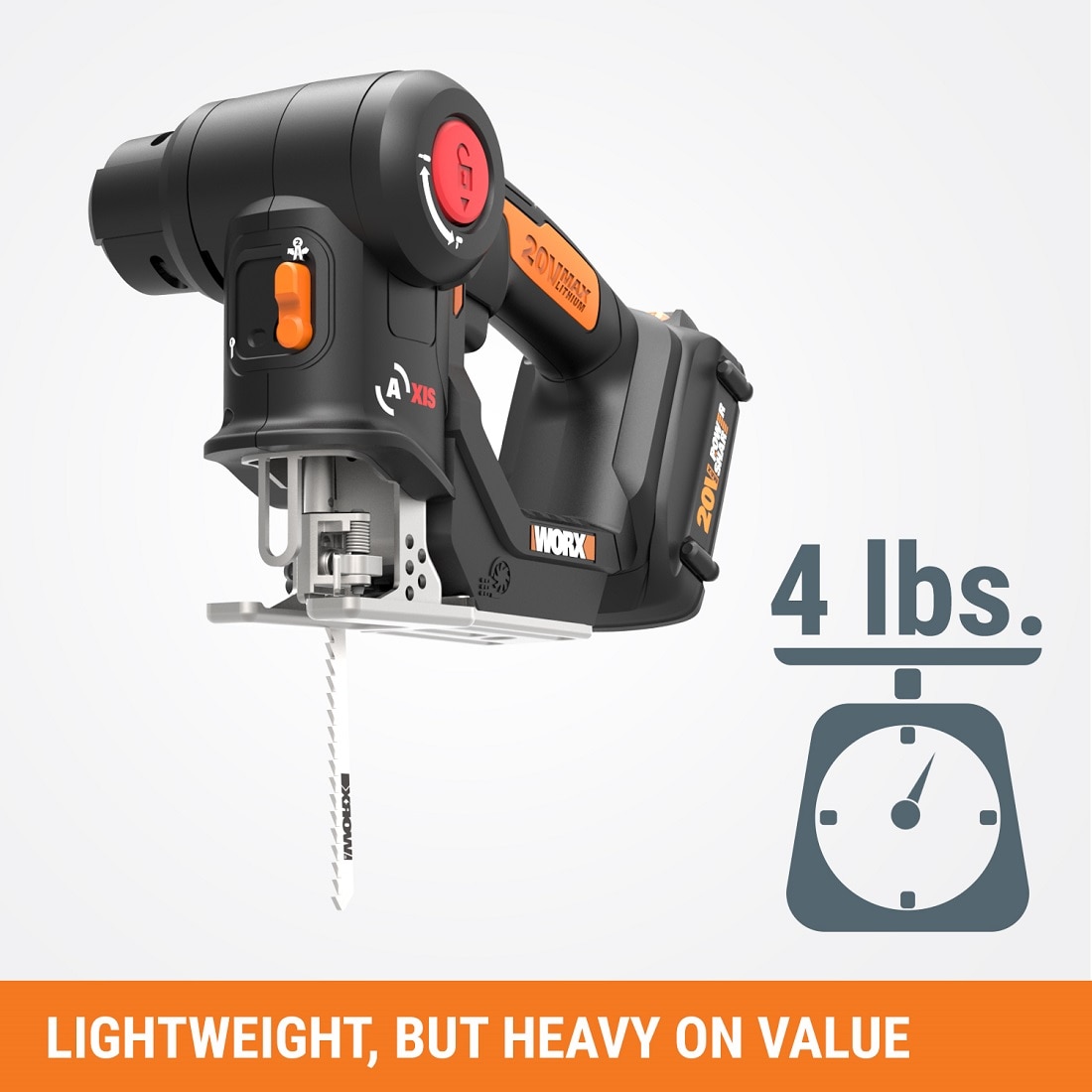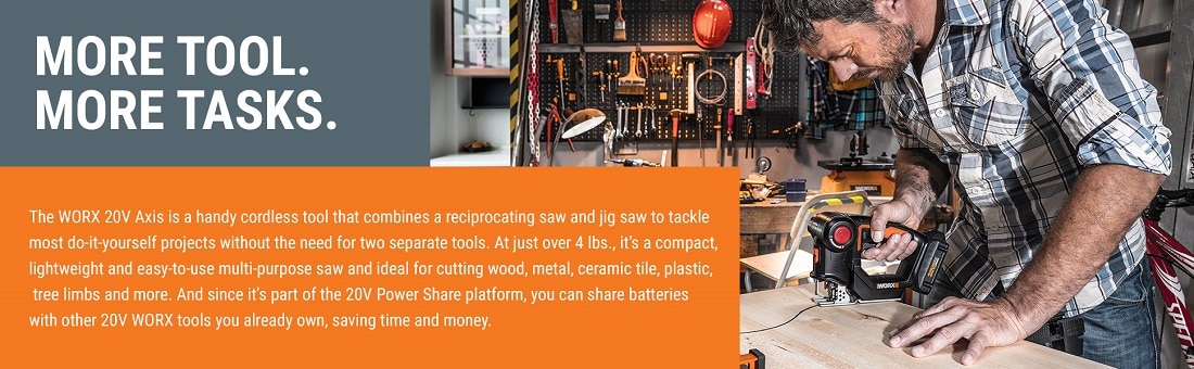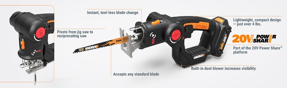 This 20V Axis Reciprocating/Jig Saw 2-in-1 gives you a whole lot of tool(s) for the money. There's no need to buy a separate reciprocating saw and jigsaw when you have an Axis. Worx engineers figured out that those two saws actually employ a similar motion to get their different jobs done, and designed a way to put that functionality into one tool. So you get the raw power of a reciprocating saw (3000/min of no-load speed) to tear down structures, but then the head folds down into the base to give you more balance to make those intricate cutouts that only a jigsaw can perform. Plus, there's no cord to get in your way, so you're free to move. And at only 4.2 lbs, you can work long hours without getting hand and arm fatigue. The jigsaw is made to cut through wood (2" cutting capacity), PVC pipe (2"), and steel plate (5/32"). While the reciprocating saw also cuts wood and PVC pipe at 2", but steel pipe at 2", too. And they both have a ?" stroke length. With a built-in dust blower, you'll always see the shapes you're cutting in jigsaw mode. And the safety lock-off switch prevents accidental starting. Get an innovative 20V Axis Reciprocating/Jig Saw 2-in-1 from Worx and get more done, with less strain on both your hands and your wallet.