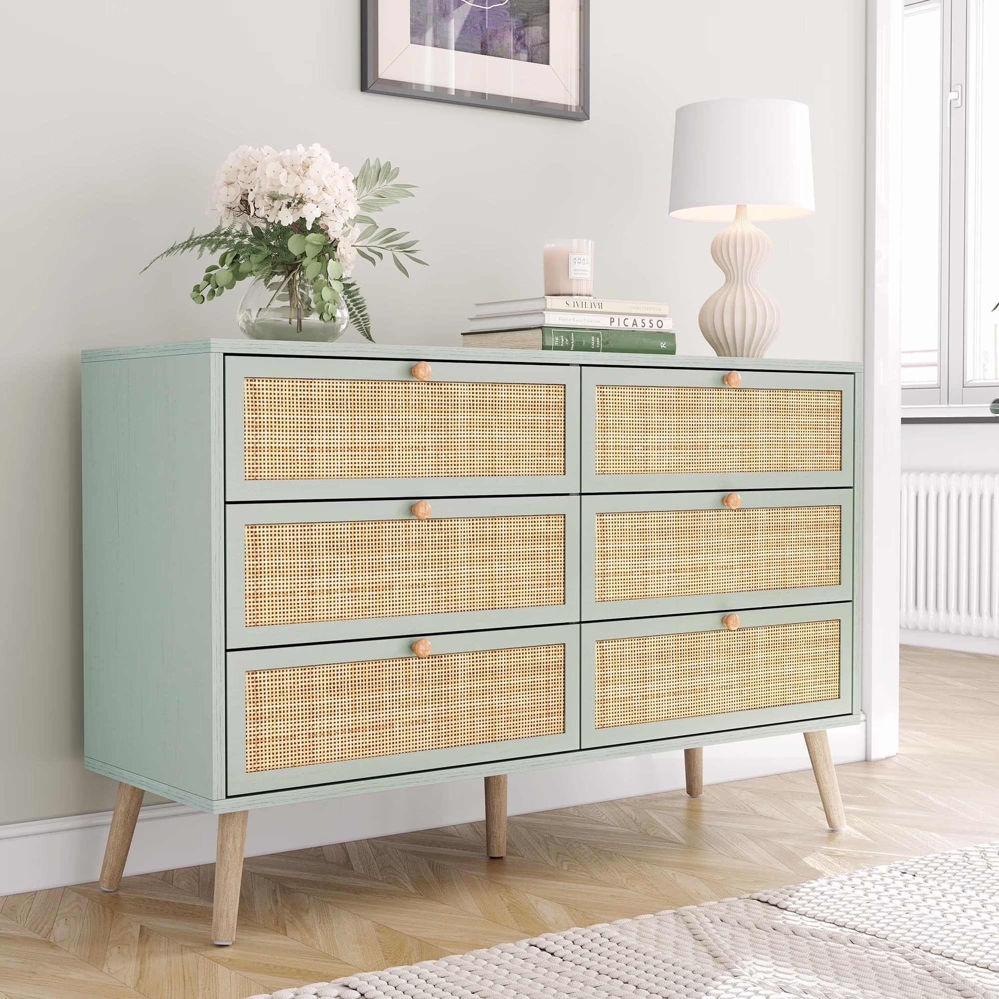 Brafabhome Rattan 6 Drawers Dresser for Bedroom, Vintage Boho Double Dresser Wicker Chest with Wooden Legs for Living Room Hallway| Mint